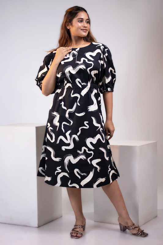 BLACK BRUSH STROKES MIDI TIE-BACK DRESS