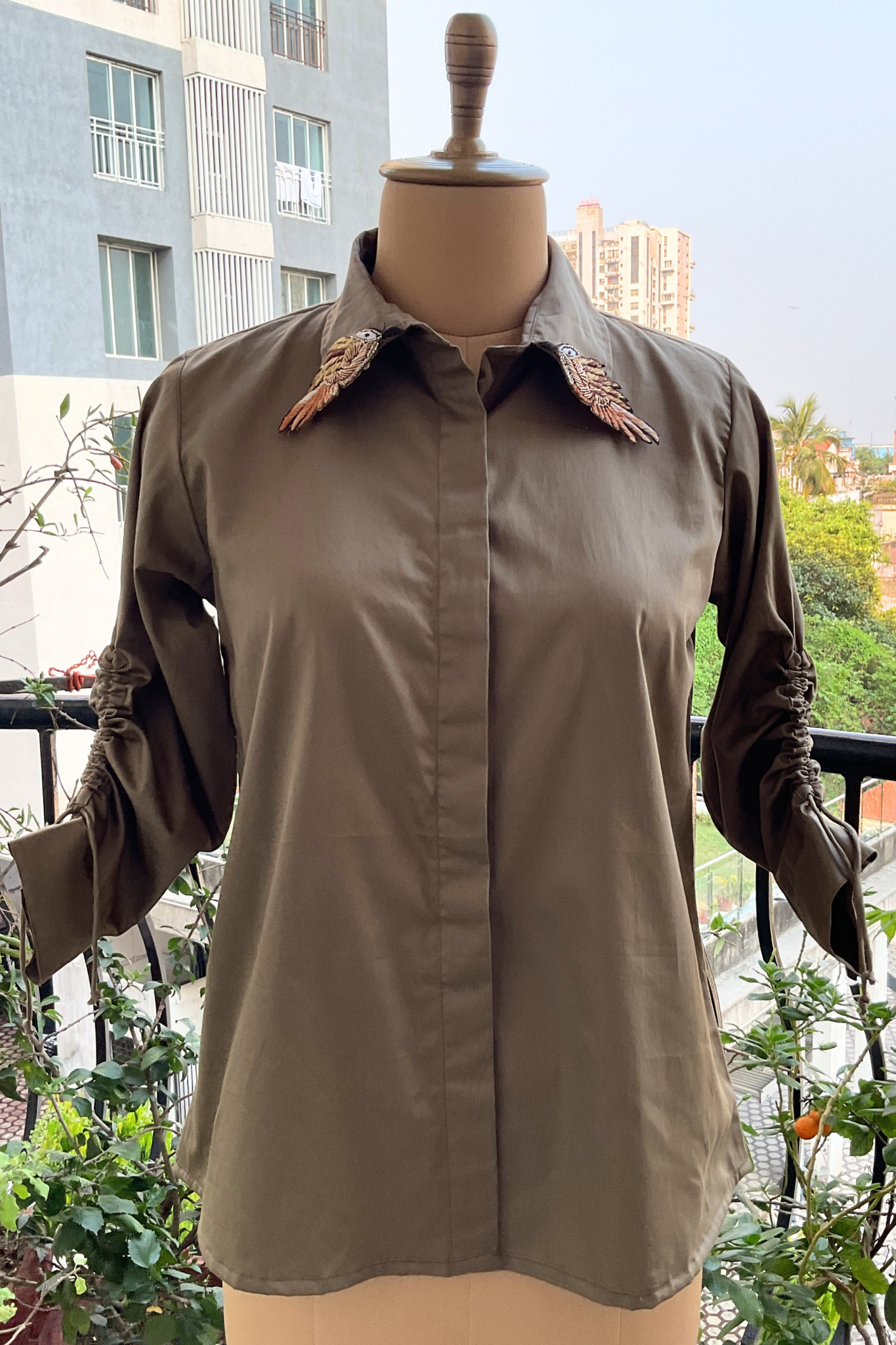 BIRD COLLAR EMBROIDERY OLIVE SHIRT